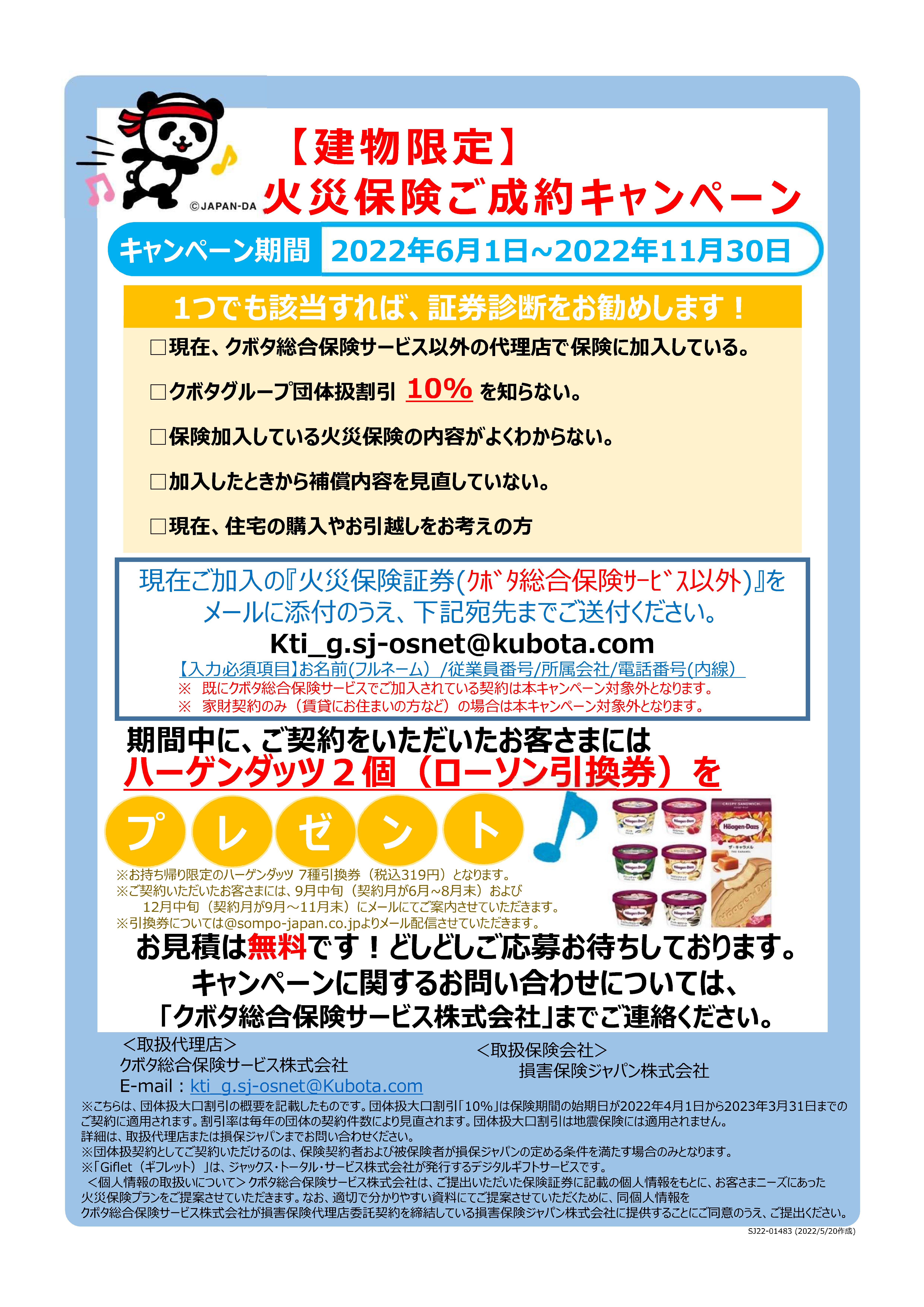このたび、弊社では期間限定(2022.6.1~2022.11.30)で火災保険ご成約キャンペーンを実施させて頂きます。